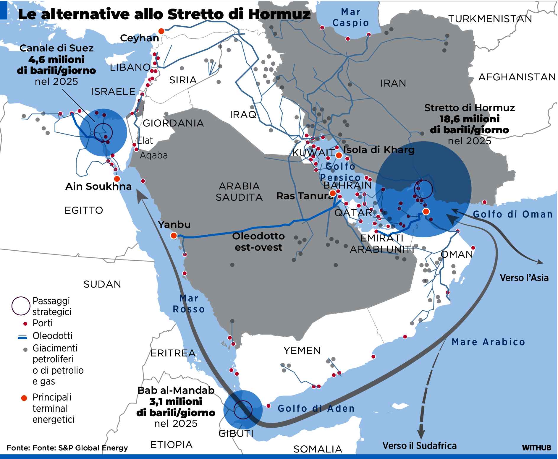 Why all this display of attention? Because about one-fifth of the world's oil and a similar share of LNG transit through Hormuz, mostly directed towards Asian markets but also crucial for Europe. When the Strait is perceived as a "war zone," maritime trade shrinks, insurance rates rise, freight costs soar, and the price of oil barrels starts to climb again. Even with Saudi and Emirati pipelines partially bypassing the Strait, alternative capacity remains limited: it is not enough to compensate for a prolonged blockade. Indeed, after the attacks and threats in early March 2026, transits collapsed, and on some days only a few ships were counted in passage.