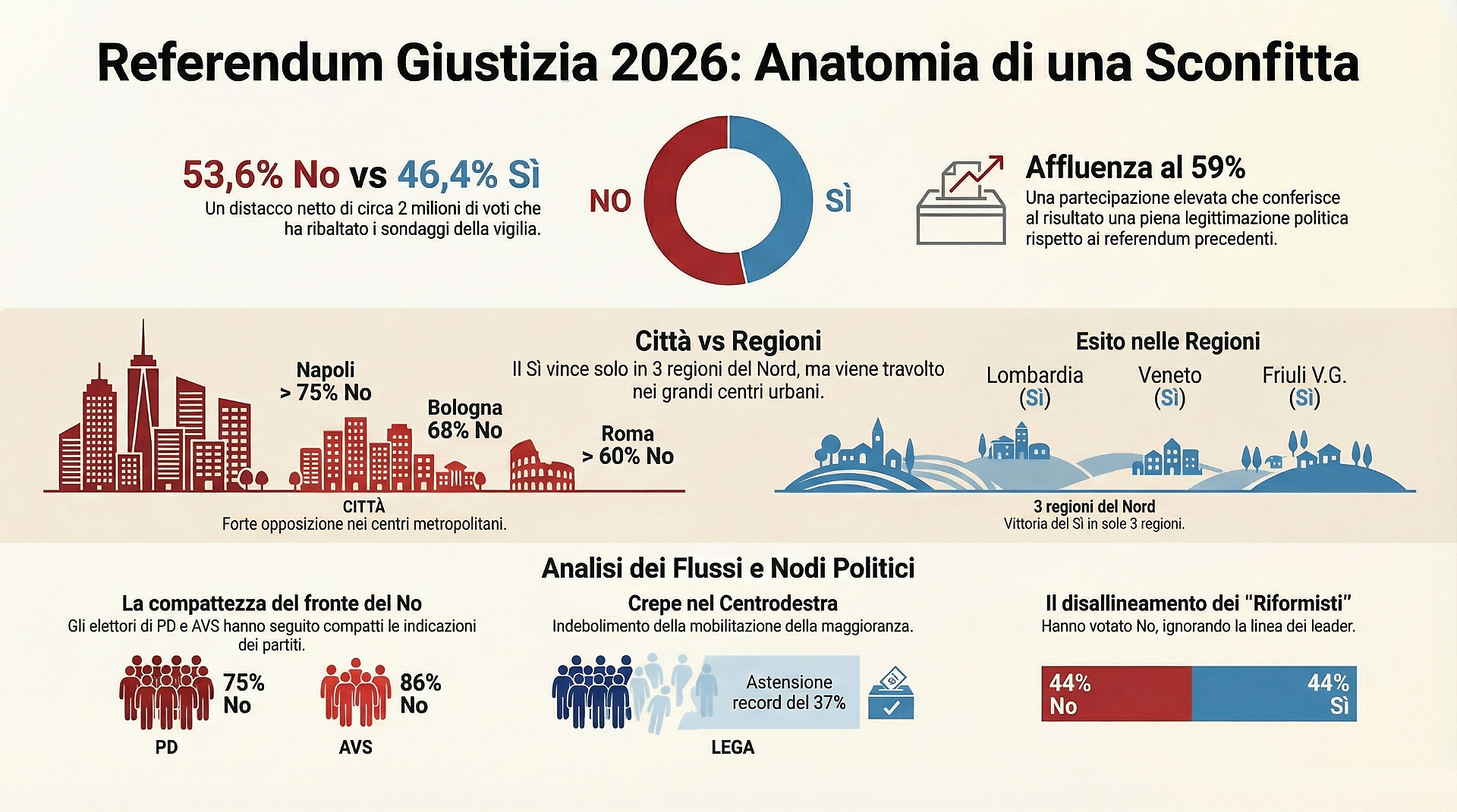 The most disruptive element of the consultation on March 22-23, 2026 is the voter turnout: almost 59% of eligible voters went to the polls, a remarkable leap compared to the 30.6% of the 2025 abrogative referendums. This strong participation gives the verdict an undisputed institutional legitimacy, transforming a topic from “insiders” into a true “value-vote” that closes any gap for contestation.